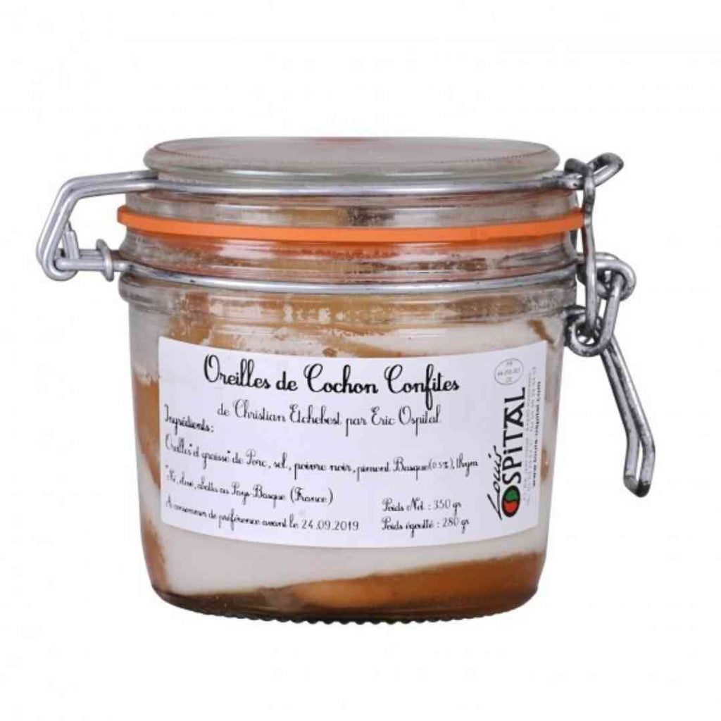 Oreille de porc (cochon né, élevé et abattu au Pays Basque), graisse de porc, sel, poivre noir, piment du pays basque (0.5%), thym. Poids bocal 350g, poids net égoutté 280g